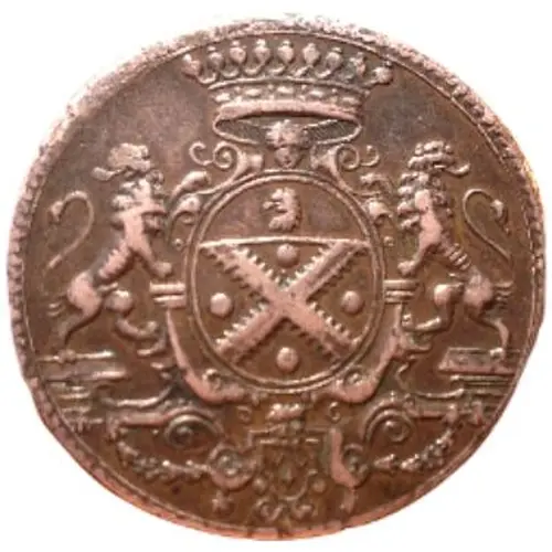 | Obverse description | No legend. Arms of Léonard Bathéon (argent with a saltire engrailed vert accompanied by four torteaux gules, on a chief azure a lion`s head or) crowned by a countal crown and supported by two lions. |