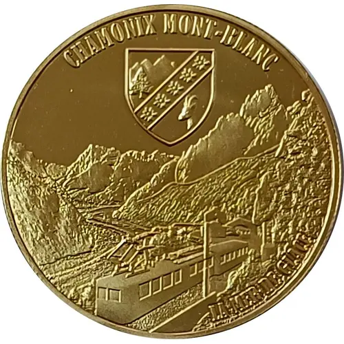 (fr) Texte en périphérie. Au centre, représentation du train d`accès à la Mer de Glace à Chamonix , commune française du département de Haute Savoie, région Auvergne Rhône-Alpes. Armoiries de la ville. |