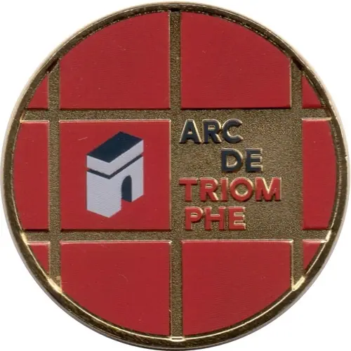 (fr) Le fond est constitué d`un quadrillage rouge. Sur l`un des carrés du côté gauche se trouve une représentation stylisée de l`Arc de Triomphe. |