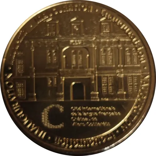 French text in seven languages on the periphery. Monnaie de Paris symbol at 12 o`clock. Various pictograms of the Centre des Monuments Nationaux converging on the center. |