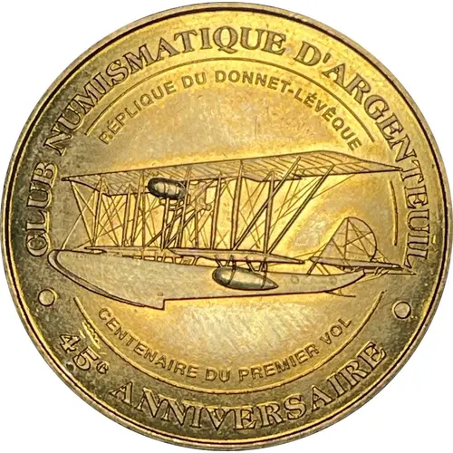 | Legenda awersu | CLUB NUMISMATIQUE D`ARGENTEUIL REPLIQUE DU DONNET - LEVEQUE CENTENAIRE DU PREMIER VOL 45e ANNIVERSAIRE |