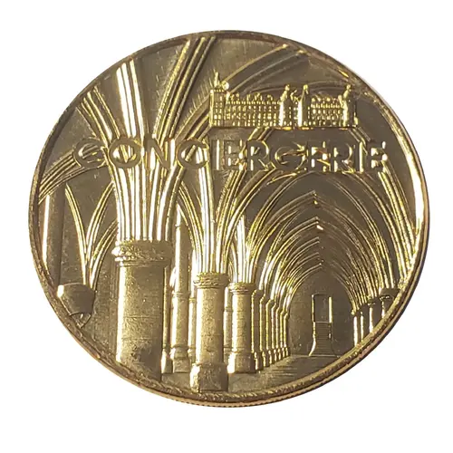 On the periphery the word France written in six languages. At 12 o`clock, the building of the Monnaie de Paris. Pictograms of the Centre des Monuments Nationaux converging towards the center. |