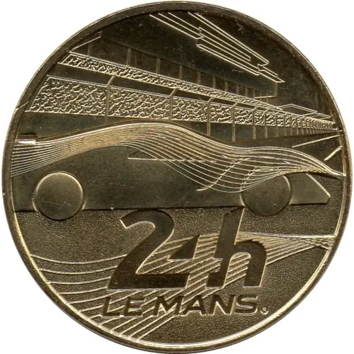 | Obverse description | Representation in front of the stand of a prototype of the famous 24h of Le Mans car race, French town of the Sarthe department, Pays de la Loire region. |