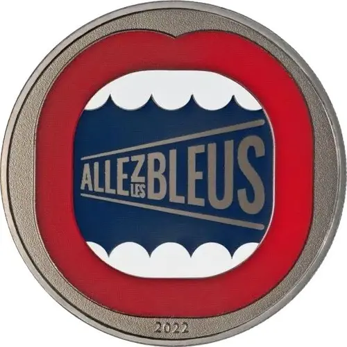 The reverse features the mouth in the center of a round of Allez Les Bleus shouts, inspired by the French cockade. |