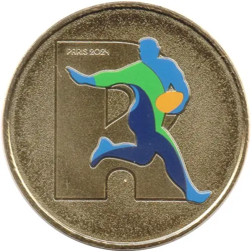 | Obverse description | Rugby player, ball on arm. Letter R in background. |