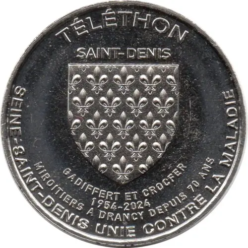 | Obverse lettering | TÉLÉTHON SAINT-DENIS GADIFFERT ET CROCFER 1954-2024 MIROITIERS A DRANCY DEPUIS 70 ANS SEINE-SAINT-DENIS UNIE CONTRE LA MALADIE |