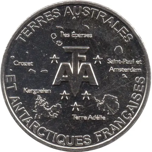 In the center, the logo of the French Southern and Antarctic Lands and in the background, the territories that are part of this administrative entity. |