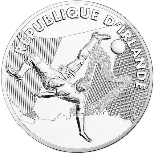 | Ön yüz açıklaması | A player from the Irish soccer team, riding a bicycle. In the background, a city and the Celtic harp on the coat of arms. In the background, the Irish flag. |