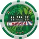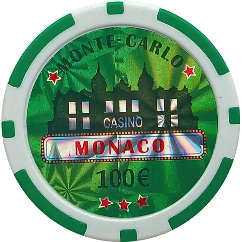 (fr) Le casino stylisé en noir, fenêtres en blanc au dessus d`un cartouche, le tout sur un fond de couleur vert et l`ensemble dans un cercle blanc doublé d`un deuxième cercle vert et blanc. Valeur faciale en exergue. |
