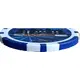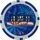 (fr) Le casino stylisé en noir, fenêtres en blanc au dessus d`un cartouche, le tout sur un fond de couleur bleu et l`ensemble dans un cercle blanc doublé d`un deuxième cercle bleu et blanc. Valeur faciale en exergue. |