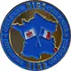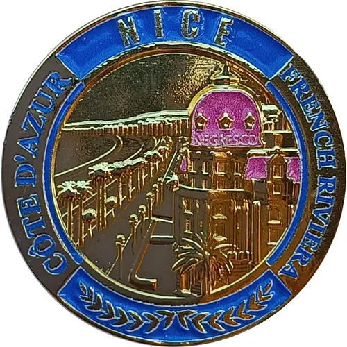 (fr) Texte doré sur fond bleu en périphérie. Au centre, carte de la France en bleu, avec le drapeau de la France sur la droite et sur la gauche le drapeau de la ville de Nice. Un point rouge situe la ville de Nice sur la carte. |