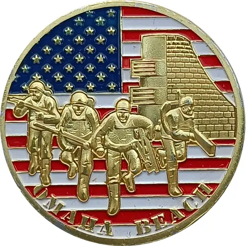 | Opis awersu | American flag colored in the background. American soldiers disembarking from a barge on the Normandy beach `Omaha Beach`. |