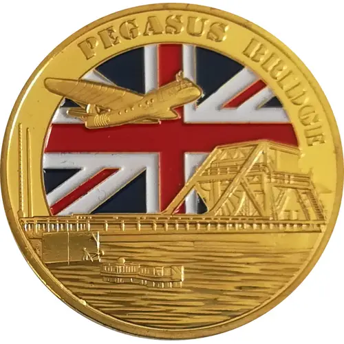 | Obverse description | Representation of the Pegasus Bridge with the flag of the United Kingdom in the background. Historic site located in Bénouville, a commune in the Calvados department, Normandy region. Above the bridge, a glider. |