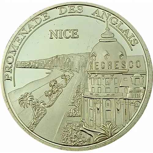 Text in the periphery. View of the Negresco hotel and the Promenade des Anglais. |