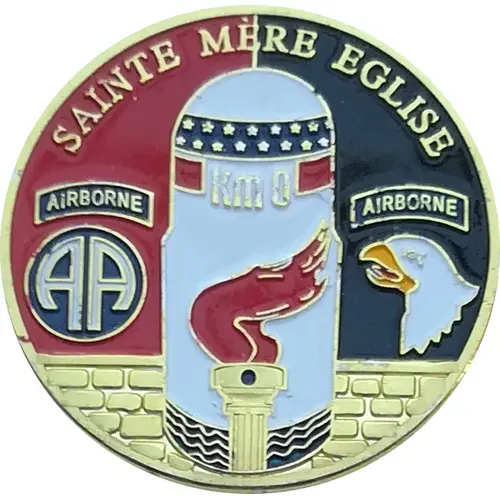 Representation of the `0` milestone on the voie de la liberté in Sainte-Mère-Eglise, a French commune in the Manche département, Normandy region. Emblem of the 101st Airborne Division on the right and emblem of the 82nd Airborne Division on the left. |