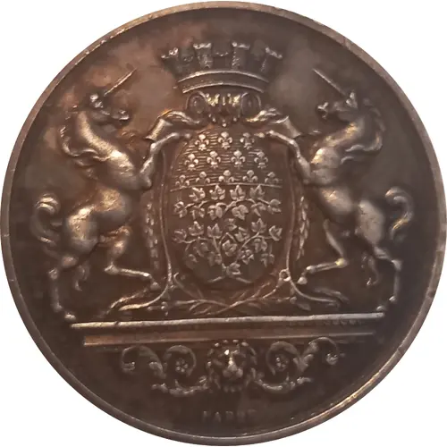 | Obverse description | Blazon of Amiens tourelé on pedestal surrounded by two heraldic unicorns signed Barre. |