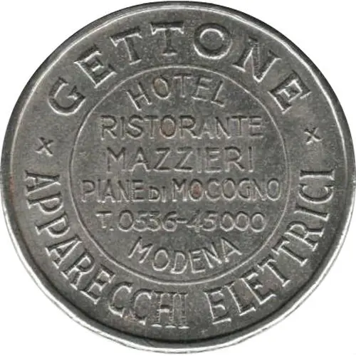 | Obverse lettering | GETTONE HOTEL RISTORANT MAZZIERI PIANE DI MOCOGNO T. 0536-45000 MODENA APPARECCHI ELETTRICI |