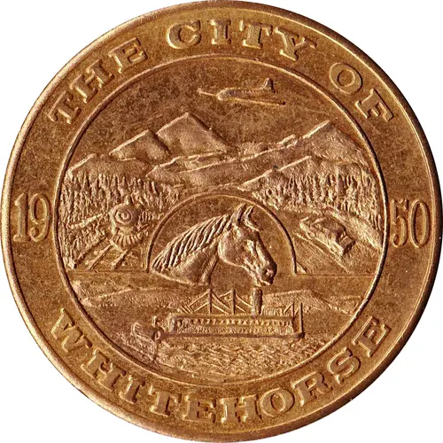 | توضیحات روی توکن | Design emblematic of the City of Whitehorse (with horse, bush plane, mountains, river, train, etc.) surrounded by legend |