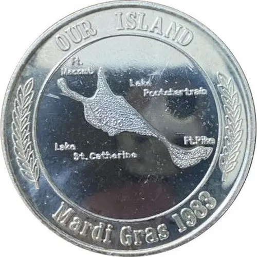 | Obverse lettering | OUR ISLAND Ft. Macomb Lake Pontchartain Lake St. Catherine Ft. Pike Mardi Gras 1983 |