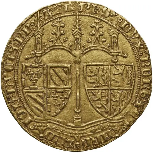 | Opis awersu | Arms of Burgundy and Brabant-Limburg under gothic canopy. |