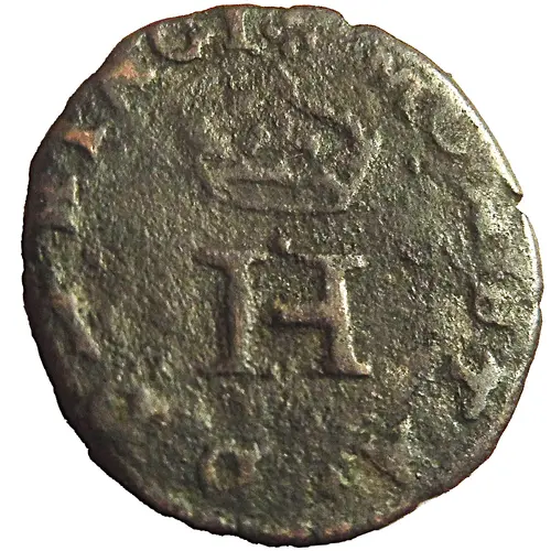 Technical/Grading: For this Liard (MIR#636), high-grade examples will exhibit strong definition of the central crowned 'H', particularly the crown's elements and letter serifs. The *fleur-de-lis* details on the cross should be distinct, with clear petal separation. Due to its billon composition, planchet imperfections, weak strikes, and corrosion are common. Legibility of any peripheral legends, often partial on these small issues, is also critical. Wear typically first affects the highest points of the crown and the cross's center.