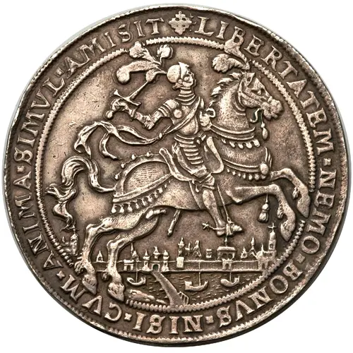 | Obverse description | Armored knight on horseback with Latin legends surrounding. |