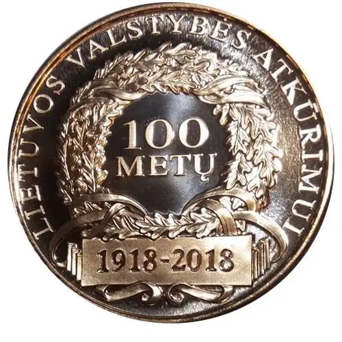 | Obverse lettering | LIETUVOS VALSTYBĖS ATKŪRIMUI 100 METŲ 1918-2018 |