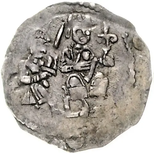 | Obverse description | Seated crowned figure holding right hand over chest and a lilly scepter in the left, to the left a standing figure turned right holding a sword with both hands. |