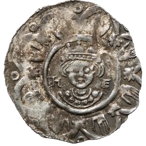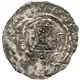 Enthroned bishop wearing a miter with long ribbons; crosier in his right hand, a closed book in his left. Remains of writing between pearl circles. |