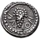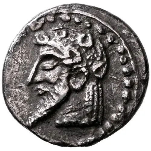 | Descrição do anverso | Head of bearded Dionysos to left, wearing ivy wreath; all within border of dots. |