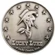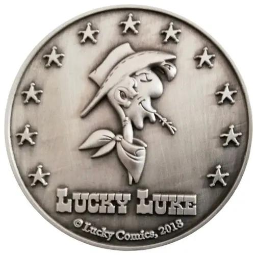 Visual of the stagecoach drawn on the cover of the album. Above, the inscription `1968-2018` separated by a sheriff`s star, and the signatures of Goscinny and Morris. Below, cartouche engraved with the individual number of the medal between two sheriff`s stars. |