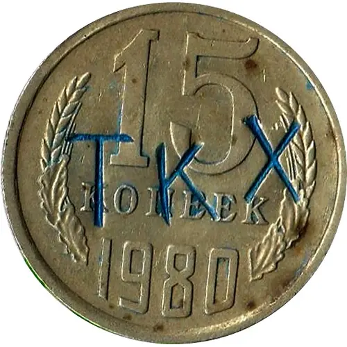 | Obverse description | USSR 15 kopecks reverse with counterstamp, inked blue. Value and date flanked by sprigs. TKX = Тбилиси Камера Хранения (Tbilisi. Luggage Storage). |