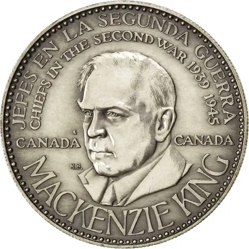 William Mackenzie King left, text in Spanish and English: name of the series above, person name below, country on sides |