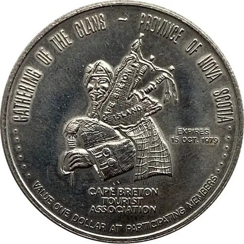 | Leyenda del anverso | GATHERING OF THE CLANS - PROVINCE OF NOVA SCOTIA EXPIRES 15 OCT. 1979 CAPE BRETON TOURIST ASSOCIATION VALUE ONE DOLLAR AT PARTICIPATING MEMBERS |