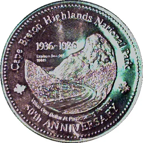| Obverse lettering | Cape Breton Highlands National Park 1936-1986 Expires [unintelligible] 1986 Value One Dollar At Participating Members 50th ANNIVERSARY |