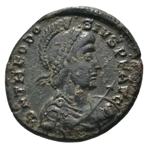 | توضیحات روی سکه | Bust of Theodosius I, helmeted (with pearl-diadem), draped and cuirassed, right, holding spear and shield in front. |