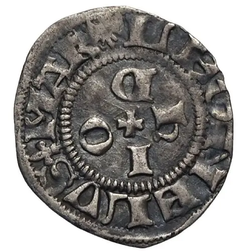 Reverse description Large gothic A with four dots around, within reeded inner circle. Legend ends with fleur-de-lis and small city shield.