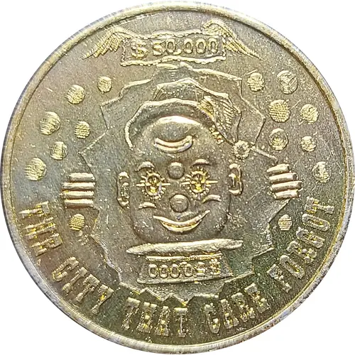 $50,000 inside banner with wings at top. Lettering at bottom: The City That Care Forgot. Clown in center appears to be coming out of a hole in token. When viewed upright, clown is smiling. When viewed upside-down, clown in frowning with $50,000 inside hat. Several balls appear on both sides of clown. |