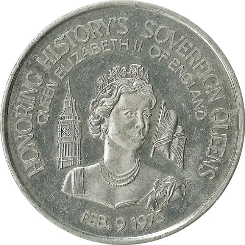 | Obverse lettering | HONORING HISTORY`S SOVEREIGN QUEENS QUEEN ELIZABETH II OF ENGLAND FEB. 9 1975 |