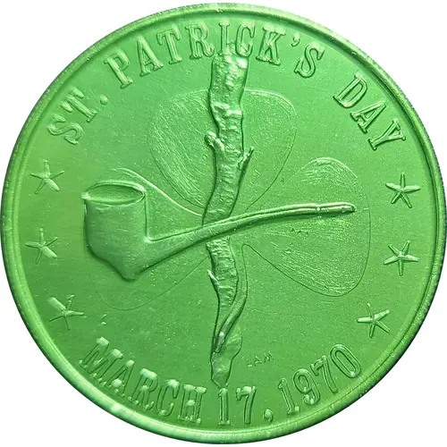 Lettering at top edge: St. Patrick`s Day, at bottom edge: March 17, 1970. In the center are images of St. Patrick`s walking stick and pipe in front of a shamrock with three stars on either side. |
