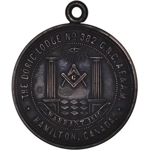 | Obverse lettering | THE DORIC LODGE Nᐤ. 382 G.R.C. A.F. & A.M. WARRANT 1880 HAMILTON, CANADA. |