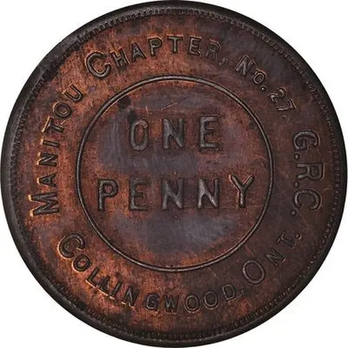 | Chữ khắc mặt trước | MANITOU CHAPTER, R.A.M. Nᐤ. 27. G.R.C. ONE PENNY COLLINGWOOD, ONT. |
