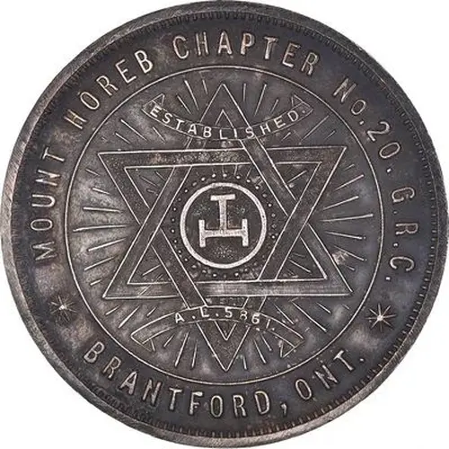 | Obverse lettering | MOUNT HOREB CHAPTER No. 20. G.R.C. ESTABLISHED A. L. 5861. BRANTFORD, ONT. |