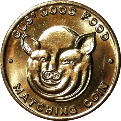 | Obverse lettering | GUS` GOOD FOOD MATCHING COIN |