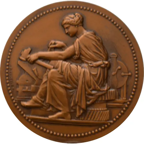 | Obverse description | Seated woman, legs crossed, holding a hammer in her left hand. |