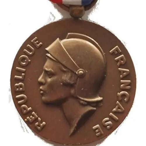 | Arka yüz açıklaması | Rectangular nameplate surmounted by the inscription `AIR`, above a pair of wings horizontal and a propeller vertical on a rising sun, surrounded by a branch of laurel leaves and a branch of oak leaves. All surrounded by the inscriptions `MINISTÈRE DE LA DÉFENSE` at the top and `HONNEUR - TRAVAIL - DÉVOUEMENT` at the bottom. |