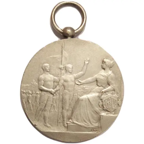 | Obverse description | Woman on throne leaning on a FGSPF shield, welcoming athletes, one of whom is carrying a flag. unidentified signature |