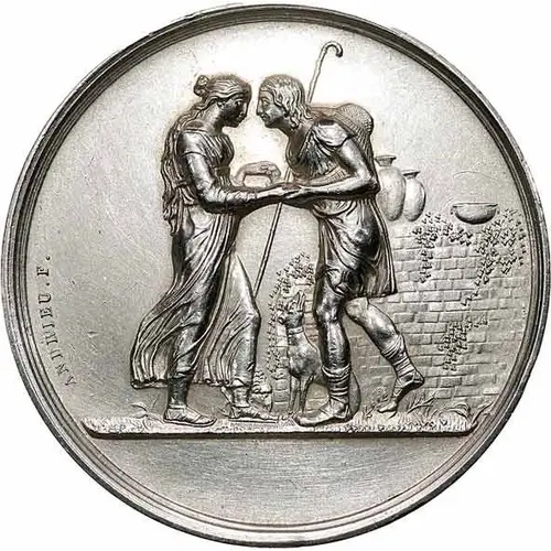 | Obverse description | Jacob, accompanied by his dog, hat on his back and hatchet on his right shoulder, goes to meet Rachel, taking both her hands. Wall with jugs and ivy in background. |