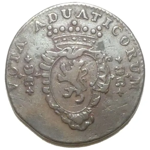 Within a decorated cartouche, the Namur coat of arms, a lion standing on the left surmounted by a crown and, on either side, a lighter with flames; the legend in a semicircle on the upper half, pearled edge. |