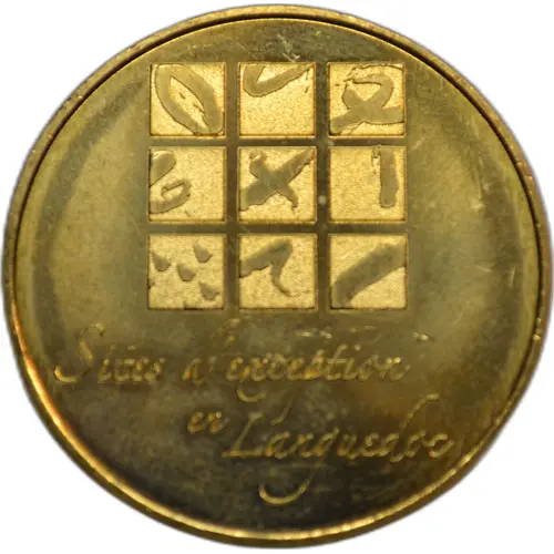 On the periphery, the word France written in eight languages. France at 12 o`clock, 2016 at 6 o`clock, all linked by 14 stars on the right and left. In the center, the building of the Monnaie de Paris. |